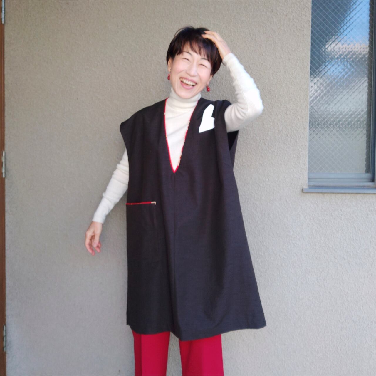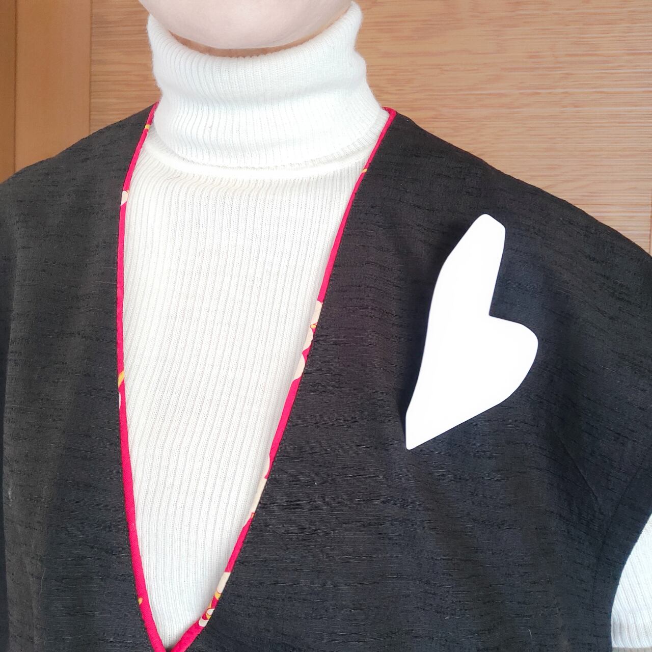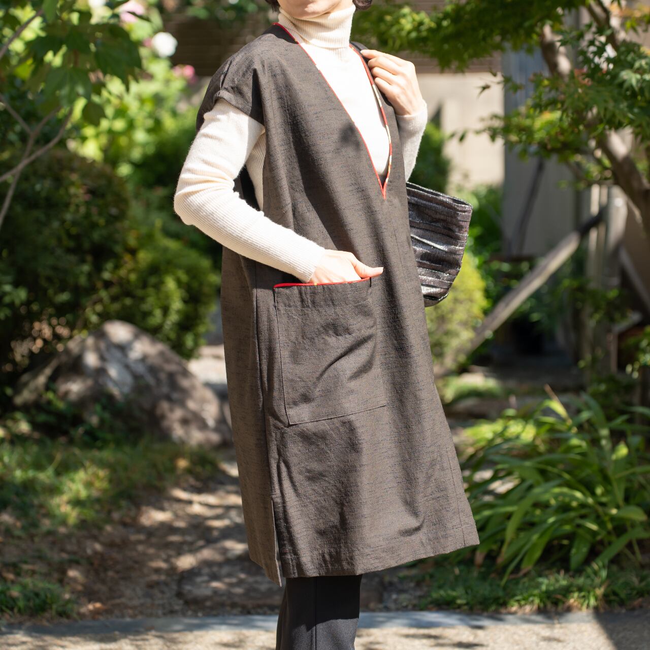 大きく開いたVネックとポケットの鮮やかな着物地の縁取りは、目を引くをアクセント。